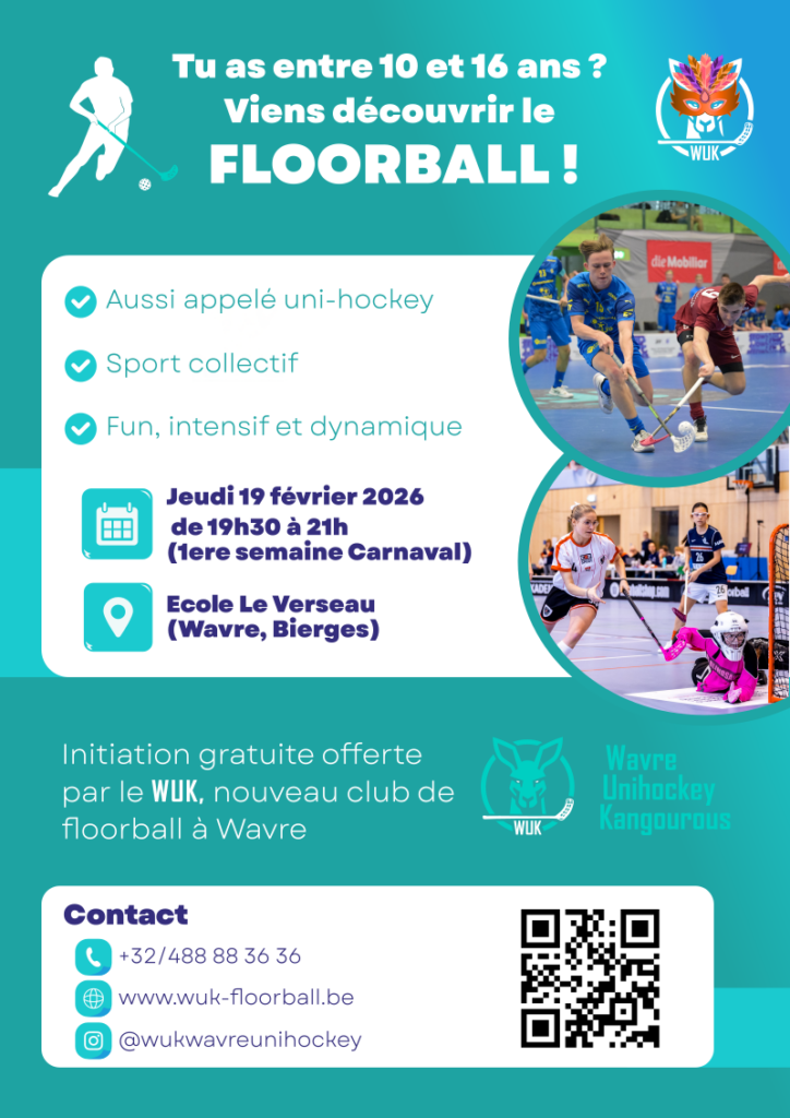 La team du WUK propose un entraînement découverte et gratuit de Floorball (Unihockey) pour les jeunes entre 10 et 16 ans. Rendez-vous jeudi 19 février à 19h30 à la salle omni-sport de l’Ecole Internationale Le Verseau (à Bierges, Wavre). Nous sommes impatient de vous y voir et de vous partager notre passion.